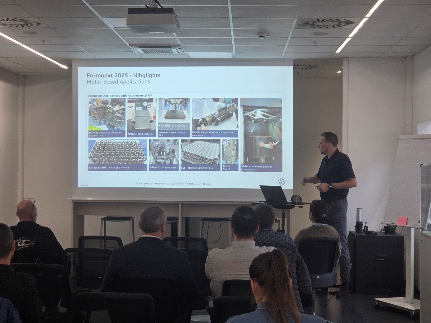 - Setkání se zaměřilo na aktuální stav a aktivity v oblasti aditivní výroby napříč koncernem, včetně přehledů jednotlivých značek jako AUDI AG, Volkswagen, Porsche, Lamborghini a Škoda Auto.