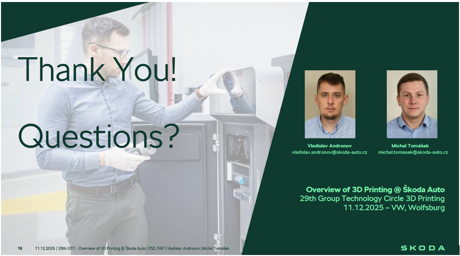 Pracovníci Škoda FabLab ve spolupráci s kolegy z Centra předsériové výroby reprezentovali Škoda Auto na 29. setkání Group Technology Circle 3D Printing. Tato akce se zaměřila na sdílení aktuálních aktivit, trendů a praktických zkušeností v oblasti aditivní výroby napříč značkami koncernu. Program zahrnoval přehledy plastových i kovových aplikací, aktuality z jednotlivých značek (Audi, Volkswagen, Porsche, Lamborghini, Škoda Auto aj.) a obecné novinky z oblasti AM, včetně poznatků z Formnext 2025 a automatizace workflow. Součástí byly také externí příspěvky, živá ukázka aplikací, diskusní výměnné session k procesům a budoucnosti 3D tisku v automotive průmyslu a volitelná prohlídka Additive Manufacturing Center ve Wolfsburgu. Akce proběhla prezenčně i formou livestreamu a byla zakončena společným shrnutím hlavních závěrů. Dohromady celého setkání se zúčastnilo více jak 80 zaměstnanců z různých značek.